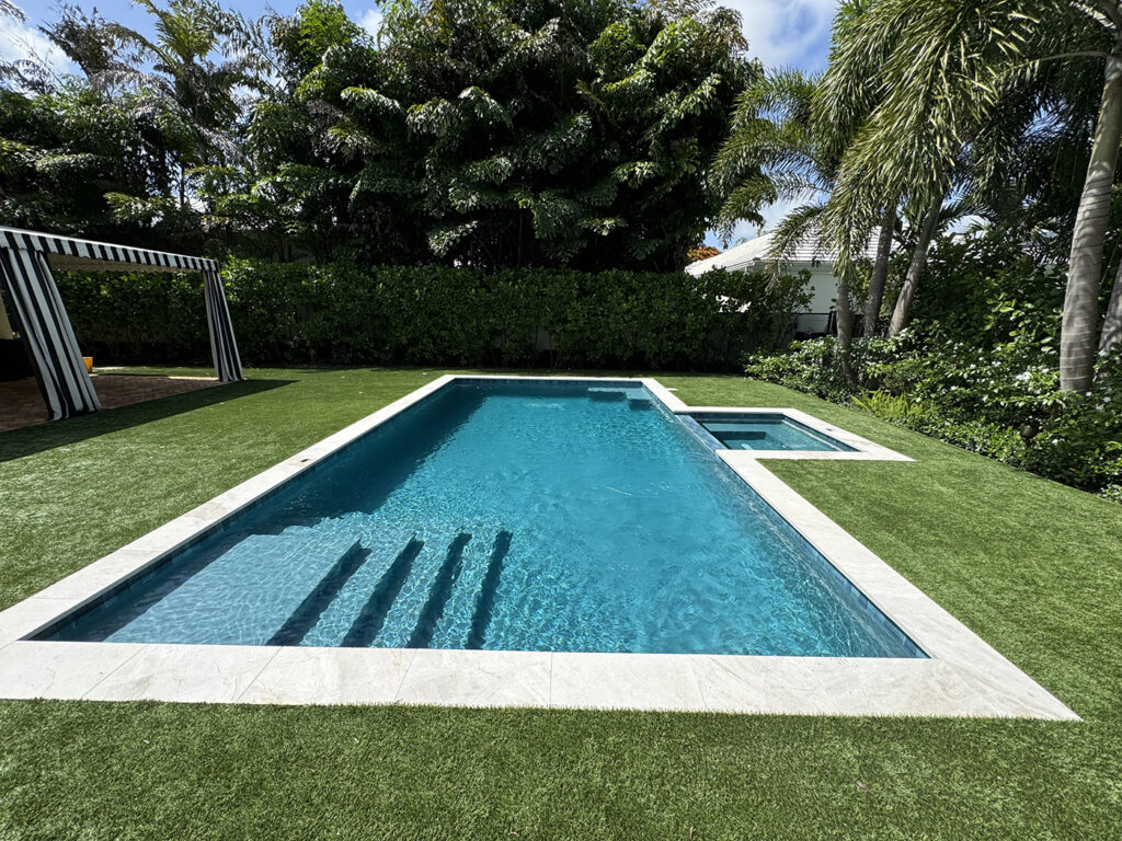 Relax in your peaceful backyard in a glamorous pool finished with Diamond Brite Watercolors Isla Verde. The uncommon color of Isla Verde will give your pool a unique appearance that will make it stand out from the average pool. The Watercolor series creates its striking colors by blending together two or more Diamond Brite pool finish colors. This luxurious looking pool was finished by Pugh’s Pools in Florida.